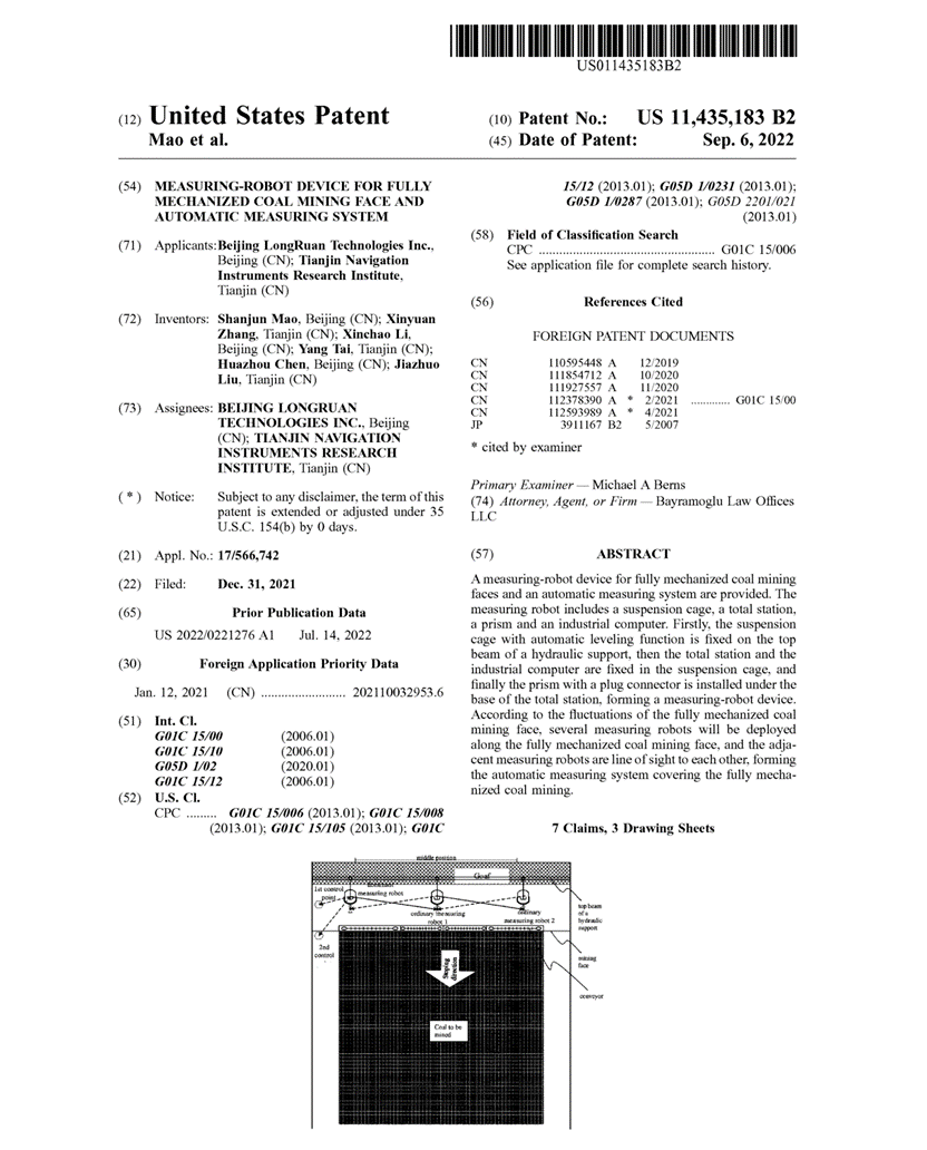 該發明于2021年5月獲國內發明專利授權,2022年9月陸續獲得國際授權,提出了一種綜采工作面測量機器人裝置和自動測量系統,測量機器人組成部分包括:吊籠、全站儀、棱鏡、工控機。將具備自動整平功能的吊籠固定吊裝在液壓支架頂梁上,然后將全站儀、工控機固定在吊籠中,最后將帶插接件的棱鏡和全站儀底座對接,形成一個測量機器人裝置。根據礦井綜采工作面起伏,沿綜采工作面依次布設多個測量機器人,且相鄰的測量機器人通視,構成礦井覆蓋綜采工作面的自動測量系統。通過所述綜采工作面測量機器人裝置和自動測量系統實現了礦井綜采工作面固定和移動目標的精確大地坐標測量。